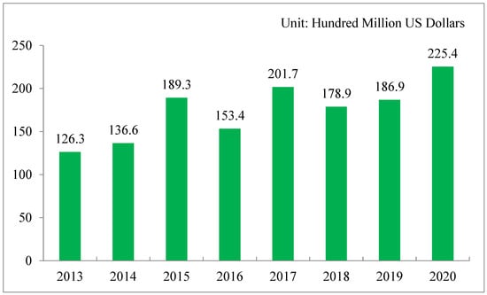 With the global response to the Silk Road Economic Belt and the 21st Century Maritime Silk Road Initiative, Chinese enterprises have been investing more overseas, achieving a simultaneous increase in scale and efficiency, thus promoting globally related products, technologies, and services. The Belt and Road Initiative has given birth to a new model of international cooperation in the field of mineral resources and provides a new opportunity for China’s mining industry to become global. Since the Belt and Road Initiative was launched in 2013, China’s overseas direct investment in the mining industry has grown rapidly (Figure 1). In 2013, China’s stock of outward foreign investment in the mining industry exceeded USD 100 billion for the first time, and at the end of 2020, China’s outward foreign direct investment in the mining industry reached USD 175.88 billion, accounting for 6.8% of the total outward foreign direct investment, mainly in oil and gas exploration, the mining and mineral processing of nonferrous metals and ferrous metals, coal mining, etc. This is one of the six industries representing the stock size of one hundred billion US dollars [1,2]. As one of the five largest mineral resource countries in the world, South Africa is China’s largest source of imports and its main trading partner on the African continent. The South African government encourages foreign mining investment, and it has a close and friendly relationship with China, so South Africa is one of the areas that Chinese mining enterprises focus on. However, the overseas investment project is large, the cycle is long, and the unpredictable factors are numerous, so the resource-based enterprises face a greater risk [3,4,5]. Therefore, to promote the sustainable, rational, orderly, and healthy development of overseas mining investment and to guide enterprises in the scientific assessment and prevention of overseas mining investment risks, an objective summary of the rules of overseas mining investment and protection against investment risks has strong research value [4,6,7,8,9,10,11,12].