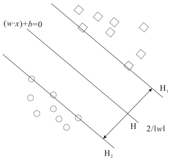 The main idea of a support vector machine is the process of constructing an optimal classification hyperplane by mapping an input vector to a high dimensional eigenspace via pre-selected nonlinear mapping. The support vector machine is developed from the optimal classification surface in the linear divisible case. The basic principle is shown in Figure 2. The rhombic and circular points in the figure represent the two types of samples respectively, and H is the classification line, H1 and H2 are the closest samples to the classification line and parallel to the classification line, and the distance between H1 and H2 is called the classification interval. The so-called optimal classification line is that the classification line can not only separate the two classes correctly, but also guarantee the maximum separation.