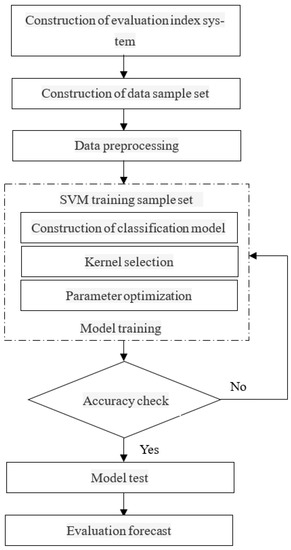 First, the factors affecting the risk of overseas mining investment are comprehensively analyzed, the key evaluation indices are selected, and the evaluation index system is constructed. The data sample set of evaluation indices is constructed via data collection. According to the grading standards of the evaluation indices, the original data are preprocessed. Then, training samples and test samples are selected from the preprocessed data, suitable kernel functions are selected, and the parameters are optimized. Support vector classification is trained with training samples. The risk evaluation model of overseas mining investment based on SVM is established to evaluate the risk level of the test evaluation samples. The specific evaluation flow based on SVM is shown in Figure 3.
