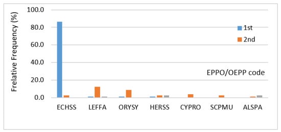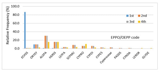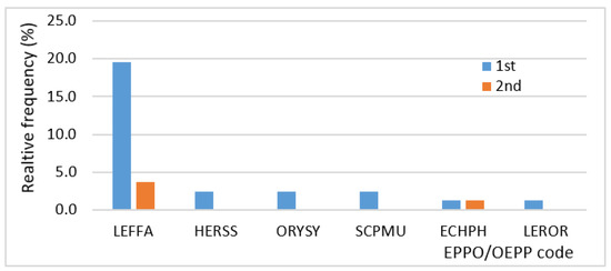 In Portugal, the main rice weeds are Alisma plantago-aquatica L. (Alismataceae); Cyperus difformis L. (Cyperaceae); Echinochloa, crus-galli ssp. hispidula (Stapf) Koss./Vasc. (Poaceae); Echinochloa phyllopogon (Stapf) Koss./Vasc. (Poaceae); Heteranthera reniformis L. (Pontedereaceae); Leptochloa fusca ssp. fascicularis (Lam.) Gray (Poaceae); Oryza sativa L. var. sylvatica (Poaceae) [15]. In Figure 2 and Figure 3, weed species are identified by EPPO code (Appendix B). To identify the most problematic weeds, rice growers were asked to rank five weeds in order of importance. It was not always easy for farmers to correctly identify plants, as in the case of sedges, which include several species, out of which Cyperus difformis is the most consequential. However, this species in Sorraia valley (Ribatejo) was referred to by some as ‘rice field bulrush’, a common name that corresponds to another species (Schoenoplectus mucronatus (L.) Palla) that is not relevant in the region. According to the perception of rice growers, the most worrying weeds are Echinochloa spp., which are suspected of resistance. These weed species outperformed all others when farmers were asked about examples of resistant weeds in their fields. Other weeds were also mentioned, particularly O. sylvatica, A. plantago-aquatica and Heterantera spp. (Figure 2).