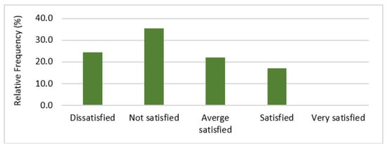 Post-emergence herbicides are the farmers’ main tool for weed control. The survey shows that profoxydim was the most widely used herbicide (53.8%) in all three regions as the main herbicide in the programs. It was possible to assess through the surveys that the use of the herbicide profoxydim, either alone or together with other herbicides such as imazamox, bispyribac–sodium or the formulated mixture penoxsulam + cyhalofop, had a prevalence of 92% in Mondego (Beira Litoral), 77% in Sorraia (Ribatejo) and 83.3% in Sado (Alentejo). Growers were even less satisfied with the efficacy of post-emergence herbicides to control Echinochloa spp. than with that of pre-emergence herbicides. More than half were “Not satisfied or dissatisfied” (Figure 6).