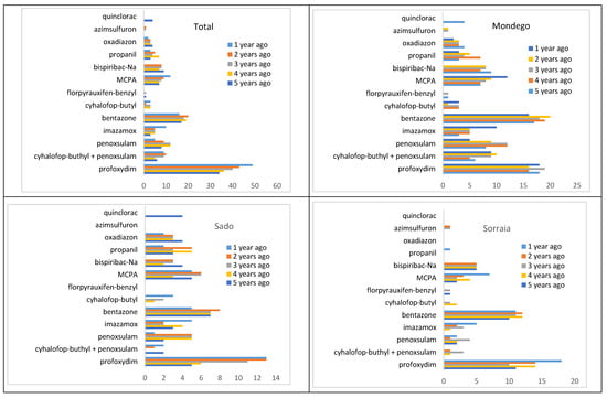 There are five herbicides that stand out, being mentioned by more than 50% of the growers in all regions over the five-year total. These are, in descending order of importance: profoxydim, bentazone, penoxsulam (applied alone or mixed with cyhalofop-P-butyl), MCPA and bispyribac–sodium (Figure 7). It is worth mentioning that, although imazamox is in sixth place, this herbicide presents differences between regions, as we will see below.