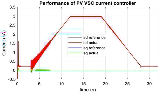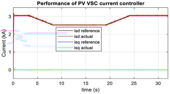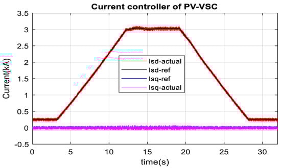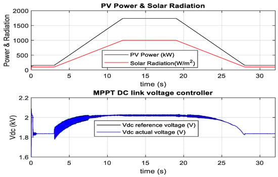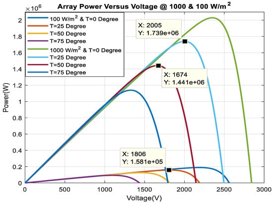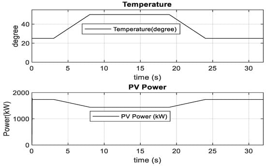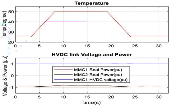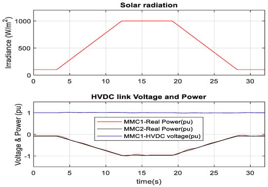 The solar energy-connected MMC-HVDC network is illustrated in Figure 1. MMC1 regulates the HVDC link voltage, and MMC2 creates the AC voltage for solar farm integration. From the PV panel’s power versus voltage characteristics curve, as shown in Figure 2, the optimum output power of the PV panel changes with solar radiation and temperature. Therefore, the purpose of the PV side converter is to adjust the DC link voltage to extract the peak PV energy under temperature and solar radiation variation. The inner current dynamics of the grid side converter (GSC) in the steady state are denoted by the following equation [].