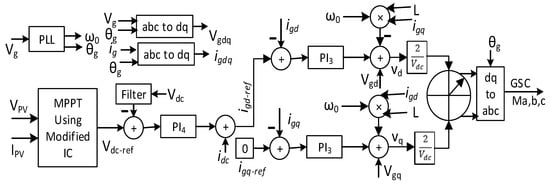 Finally, Equations (1)–(3) governs the complete dynamics of GSC, whereas Equations (5) and (6) provides the reference DC link voltage for maximum PV power tracking. Figure 3 shows the PV side converter control. If the successive sample yields the same PV voltage, then the change of PV power, is measured using Equation (6). DC link voltage of the PV side converter is increased with the positive increase in . However, the DC link voltage of the PV side converter is decreased with the negative increase in .