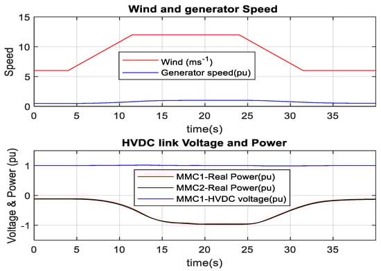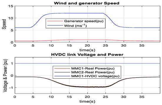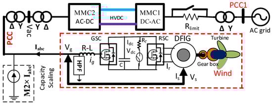 DFIG-based wind energy, including the MMC-HVDC network, is illustrated in Figure 4. MMC1 regulates the HVDC link voltage, and MMC2 creates the AC voltage for wind farm integration.