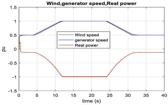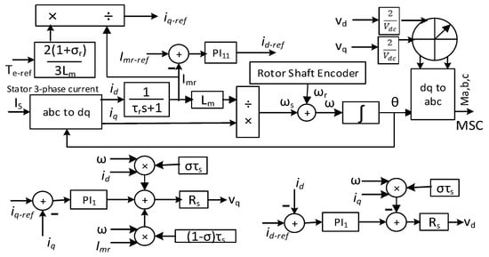 The wind turbine characteristics curve generates the optimum electrical torque reference, which further produces reference q-axis current using Equation (17). Instead of externally connected fixed capacitance, the MSC provides the required reference magnetizing current, which is found in Equation (18). Figure 8 shows the SCIG side converter control. Equation (16) consists of a PI controller (PI11) to control the magnetizing current and produce reference d-axis current. Finally, the converter dq axis voltage is generated based on Equations (13) and (14) to control the reference dq axis current. Any current deviation is processed through a PI controller (PI1), which is further added with the decoupling term and produces the dq axis voltage for the MSC. Finally, the modulating signal (abc signal) is generated from the dq axis voltage with the help of the rotor flux angle.