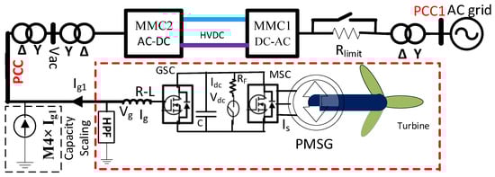 PMSG-based wind energy comprised MMC-HVDC network is illustrated in Figure 9. MMC1 regulates the HVDC link voltage, and MMC2 creates the AC voltage for the wind farm integration. The full-scale converter is also used to integrate wind energy generated from PMSG with the PCC. The grid side converter operates similarly to the grid side converter of SCIG. Hence, it is not repeated here. By controlling electromagnetic torque employing field-oriented control (FOC), machine side converter (MSC) tracks the peak point of wind energy at different wind speed. However, wind turbine characteristics is same as SCIG. In rotor-field dq coordinate, the following equation dictates the PMSG stator current []: