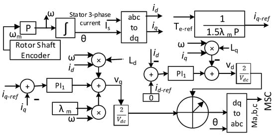 Finally, MSC current controller is formed based on Equations (19) and (20). Figure 10 shows the PMSG side converter control. Then, any current deviation is processed through a PI controller (PI1), which is further added with the decoupling term and produces the dq axis voltage for the MSC. Finally, the modulating signal (abc signal) is generated from the dq axis voltage with the help of the rotor flux angle.