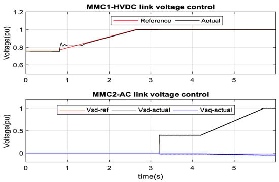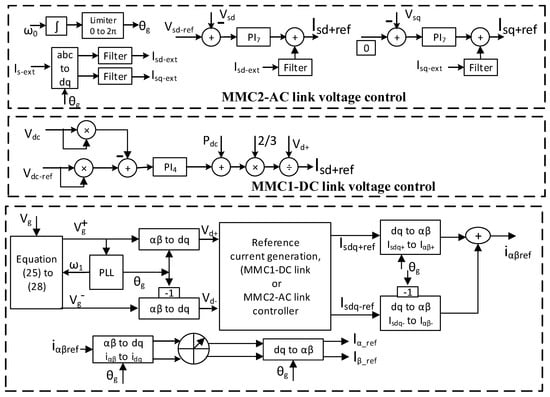 AC voltage controller provides reference current for the MMC2. As an alternative to capacitance, a small resistive load is placed on the AC side of MMC2 to employ a feedforward controller for the AC voltage control of MMC2. Along with the feedforward controller, the PI controller is also used to take counter adjustments for the AC voltage difference. The q-axis AC voltage (Vsq-ref) is controlled to zero. Negative sequence currents for MMC1 and MMC2 are regulated at zero. Usually, zero-sequence current does not flow in the Δ-transformer. Therefore, the Δ-side voltage of MMC1 in the αβ frame is: