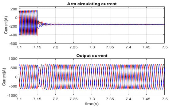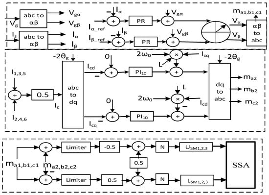 Apart from outer current control, a circulating arm current controller is required to convert the circulating current into only the dc component. The circulating current consist of a negative sequence current with angular frequency , and the following equation dictates its dynamics []: