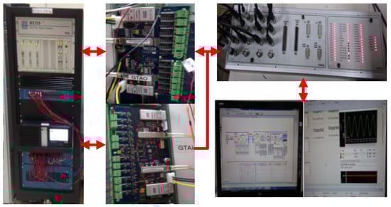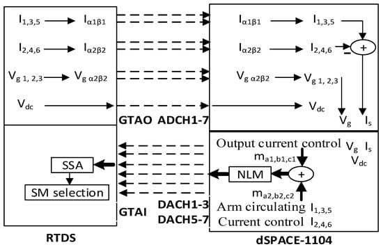 The RTDS is a real-time digital simulation device that works with other controllers and can interface with sensors in real-time. Since the simulator operates in real-time, the power system algorithms are calculated quickly enough to create output circumstances that accurately reflect conditions in a real network. Hence, integrating inverter-based resources can be more reliable by using the RTDS Simulator to verify their control. Unlike non-real-time simulation software, the tested controller on RTDS-dSPACE can be directly used to develop the practical system. Usually, the controller processes the sensor data from the physical design and provides the necessary action. RTDS works as the physical system, whereas dSPACE acts as the controller. For example, the MMC1 controller is implemented on dSPACE 1104, whereas the remaining complete procedure is developed in RTDS multi-rack platform. As can be seen from Figure 15 and Figure 16, the analog output (AO) card of RTDS provides the voltage and current signals to the analog input port of dSPACE. Finally, dSPACE processes the control algorithm and provides the required number of switching information to RTDS for MMC. Figure 17 shows the RSCAD runtime interface of RTDS.