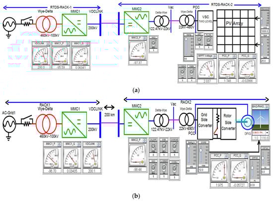 In this work, MMC detailed model-based HVDC network is developed. A comprehensive analysis for DFIG, SCIG, and PMSG-based optimal wind energy employed vector control and optimal solar energy employed modified incremental conductance is thoroughly analyzed in MATLAB/SIMULINK and compared with the controller hardware in the loop results from RTDS-dSPACE platform. The renewable energy farm is enlarged by multiplying one complete unit dynamics. Instead of capacitance-included decoupled control, a feedforward controller is used to establish an isolated AC network. The full system with all comprehensive model-based controllers and converters is modeled and simulated in RTDS and dSPACE. The effectiveness of the MMC controller is assessed against the severe symmetrical and unsymmetrical low voltage disturbances at the PCC of AC grids. In summary, the following contributions have been made: