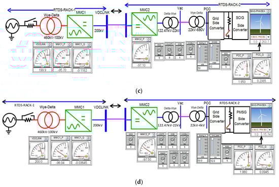 VSC-HVDC system does not require charging current, can connect variable frequency source, does not create sub-synchronous resonances, can provide reactive power support, does not propagate AC side faults, can control independently real and reactive power, and supply voltage, frequency, and black start support [,]. These advantages have made the VSC-HVDC transmission system competitive for remotely located renewable energy grid integration. The MMC is dominant in VSC-HVDC transmission due to modular characteristics, negligible harmonics distortion, and small switching power loss compared to a two-level converter [,,]. During faults, control strategies for HVDC grids have been presented [,,,]. However, the control for the arm circulating current and balancing submodule capacitor voltage was not discussed. However, a simplified average model was adopted for VSC, and experimental results were not presented. The literature [,] counts the whole wind farm as a single unit and did not consider the actual dynamics of wind farms. However, no real-time simulation was performed while preparing the results. The articles reported in [,,,] used a simplified current source for representing renewable energy integration where complete dynamics of wind generator side converter have been ignored. Similarly, a detailed model-based offshore energy-connected HVDC system has not been investigated for unbalanced fault analysis, and the experimental result was not provided in Refs. [,]. Resonance identification was presented for offshore-wind farms connected MMC-HVDC system []. Improved AC frequency and voltage control was discussed for offshore MMC station in []. Both of these works [,] employed capacitance on the high voltage AC side of MMC to establish standalone AC grids for wind energy integration and employed decouple control. Consequently, it consumes a significant amount of reactive power. However, MMC creates almost sine wave AC voltage due to the large number of submodules that do not develop harmonics distortion, and often operate without the expensive filter.