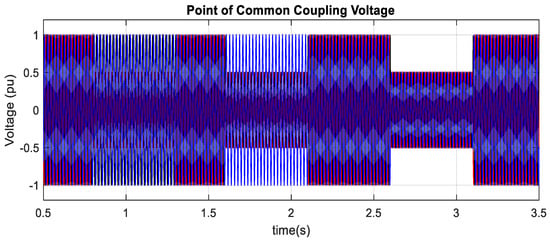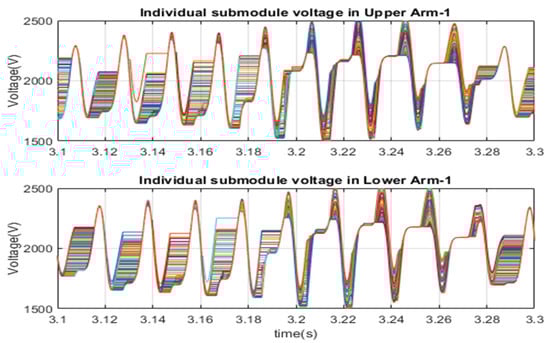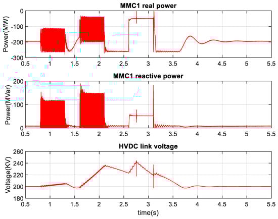 The first two terms of the left-hand side of Equations (31) and (32) process through the PI controller. The output of the PI controller adds to the decoupling term and produces the required adjustment in terms of and , which finally produces modulating signal. Modulating signal from inner current control and circulating current control goes through the nearest level modulation (NLM) to generate the number of submodules. Since the submodule (SM) capacitor voltage drifts from each other within the upper or lower arm, a submodule-sorting algorithm (SSA) is employed to place the higher voltage submodules if the current leaves or lower voltage submodules if the current enters. Figure 14 shows the outer current, arm circulating current, and submodule balancing control of MMC. Any severe fault in the PCC of AC grids (PCC1) dramatically reduces the MMC1 capacity for transferring energy to the AC grids, which raises the HVDC link voltage. Dynamic braking resistor (DBR) is designed to dissipate the excess energy during the low voltage faults at PCC1. During the single-line-to-ground (SLG), double-line-to-ground (DLG), and three-line-to-ground (3LG) faults at PCC1, DBR is turned on when HVDC link voltage is above 1.2 pu, then turned off when HVDC link voltage is below 1.1 pu.