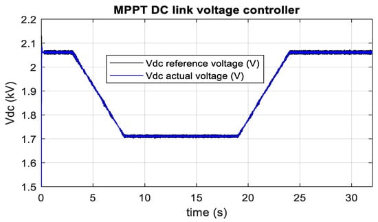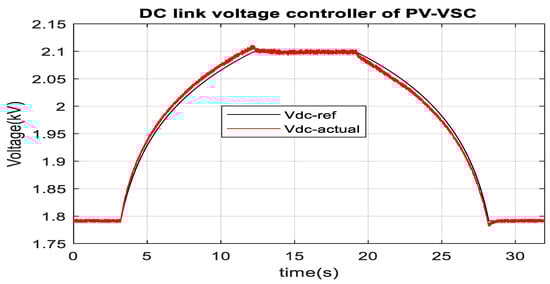 On the other hand, Equation (4) is utilized for the change of DC link voltage of the PV side converter to find the conductance. Now, the DC link voltage of the PV side converter is changed with the increase and decrease in conductance until both sides of Equation (4) are equal. A PI controller (PI4) generates the reference active current for controlling the DC link voltage provided in Equation (3). Similarly, the PI controller (PI3), along with current control dynamics presented in Equations (1) and (2), is used to follow the reference current. As shown in Figure 1, a high pass filter (HPF) is employed to bypass the high-frequency harmonics components, which arise from switching frequency.