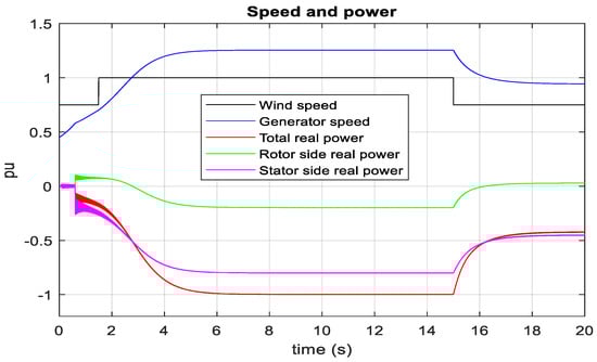The doubly fed induction generator (DFIG) transfers two-thirds of wind energy through the stator terminal, while the rotor side converter might deliver or receive energy depending on rotor speed. From the wind turbine power versus generator speed curve, as shown in Figure 5, the optimal point of turbine mechanical energy varies with wind speed. The rotor side converter (RSC) controls the optimal electromagnetic torque set by the optimal point of wind energy employed field-oriented control. Since the DFIG is controlled from the rotor side converter, the slip angle (stator flux angle and rotor angle difference) is used to convert stationary rotor current into rotary dq current, and it is also used for generating the modulating signal. The stator flux is given in α-β frame as [].