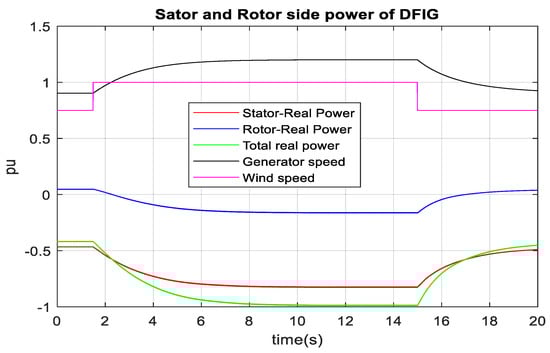Reference electrical torque is obtained from the wind turbine characteristics curve, which further generates the reference q-axis current using Equation (12). In contrast, the d-axis reference current is obtained from Equation (11). Finally, the reference dq axis current is controlled by the Equations (9) and (10). Figure 6 shows the rotor side control of DFIG. Any current deviation is processed through a PI controller (PI1), which is further added with the decoupling term and produces dq axis voltage for the rotor side converter (RSC). Finally, the modulating signal (abc signal) is generated from the dq axis voltage with the help of slip angle. On the other hand, the grid side converter (GSC) maintains the fixed DC link voltage. Power flow is bidirectional in the grid side converter since it receives power if the rotor speed is lower than the synchronous speed and vice versa. The operation of the grid side converter is the same as the GSC of PV illustrated in Figure 1. However, DC link voltage reference is constant.