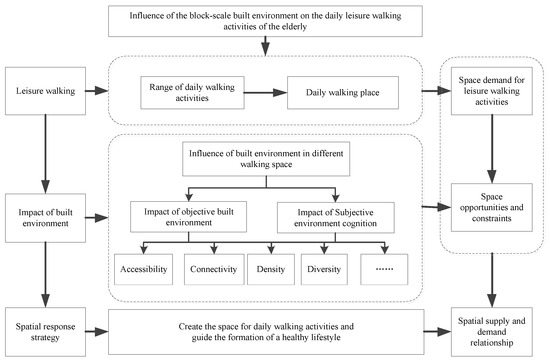 In general, studies on the correlation between the existing urban built environment and walking for the elderly mainly focus on the neighborhood block scale. The existing empirical studies mostly focus on international metropolises with a high urbanization rate, and there is a lack of studies on the adaptability of small town areas [29]. The current research is mostly in the phase of mapping between activity space and material space. The health factors mainly select morbidity, mortality, self-rated health status, and other indicators [31]. Few studies have focused on the deep potential impact of the built environment on residents’ daily physical activity from the perspective of healthy city management [27,32]. At the same time, the research on healthy cities in China is still in its initial stage. Most of the current work is focused on improving the number and density of service facilities. There are many problems with urban construction, such as excessive supply of facilities in terms of quantity and scale and insufficient quality and efficiency, which makes it difficult to effectively accommodate the specific needs of the elderly. This study focused on the elderly’s daily leisure walking activities, beginning with the elderly’s perception of the neighborhood-built environment and analyzed the impact of the block scale built environment on daily walking activities. This study revealed the effects of space demand, space opportunity, and space restriction on the leisure walking activities of the elderly at the mechanism level. The research conclusions will help guide urban planning and management departments to optimize the scale, function, and quality of the block-scale built environment to support the elderly to conduct daily leisure walking activities (Figure 1).