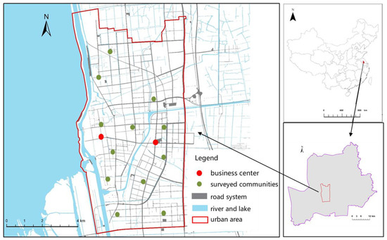 The main urban area of Gaoyou City in Jiangsu Province was chosen as the case study area; it has a population of approximately 330,000 and a built-up area of approximately 52.12 km2 (Figure 2). According to China’s seventh census, the population aged ≥60 in Gaoyou accounted for >30% in 2022. In the past 30 years, the proportion of the elderly population in Gaoyou City has been increasing, and the city has entered the deep aging stage. Urbanization is conducive to the rapid agglomeration of population, resources, and material factors and provides convenience to residents’ daily life [33,34]. However, there are also several negative effects on the elderly. On the one hand, the increase in residents’ income leads to an increase in their daily diet consumption and energy intake. On the other hand, the crowded living environment also leads to a decrease in residents’ physical exercise frequency and willingness. Although the average life expectancy of the elderly continues to increase, physical inactivity, an unbalanced diet, smoking, and alcohol consumption among the elderly have increased considerably. Living habits such as less movement and increased food consumption indirectly damage the health level of the elderly. Poor lifestyles lead to chronic diseases such as hypertension, diabetes, and cardiovascular and cerebrovascular diseases in the elderly [35]. Chronic diseases reduce the elderly’s quality of life and aggravate the economic burden of the entire society, which has become a major public health obstacle affecting the social economy and healthy development in Gaoyou [25]. This study focused on the range of daily walking activities of elderly people on a block scale. The block range includes the traffic road surface and the surrounding built-up area within a certain range. Based on the existing research, we widened the distance of urban express, main, secondary, and branch roads to both sides by 50 m, 35 m, 29 m, and 10 m, respectively. This scope is identified as the elderly’s activity space in the block scale built environment [22,27].