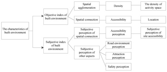 According to the place of residence and walking activities of the elderly in the questionnaire survey, we identified the range and place of walking activities of the elderly. We mapped the elderly’s subjective evaluation of the built environment elements in the objective physical space. People with different socioeconomic attributes have different resources and travel ranges. The spatial–temporal trajectory and activity space of the elderly’s physical activity also show different characteristics. Specifically, this study measured the factors of the built environment by combining subjective and objective methods. First, we constructed a table outlining the corresponding relationship between objectively built environment elements and subjectively built environment perception (Table 2). Then, we constructed a subjective perception index system of the built environment based on two aspects: spatial agglomeration and spatial connection (Figure 3).