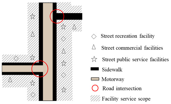 We evaluated the characteristics of a built environment from both subjective and objective perspectives. The index system combines related research results of street walkability [16,18]. We summarized the constructed environmental indicators of the blocks that affect the leisure walking activities of the elderly from four aspects: patency, accessibility, comfort, and safety. Specifically, (1) block patency means that the pedestrian road network of urban blocks is continuous and unimpeded and is not affected by the cutting of other transportation modes. Unobstructed streets provide an adequate area for pedestrians to pass through as well as continuous and stable walkable spaces (Figure 4). (2) Block convenience means the city block can provide enough public service facilities for surrounding residents and walkers. These facilities can meet the diverse needs of the elderly for the block space. The coverage and diversity of public service facilities represent the convenience of walking space. (3) Comfort index means the block provides a comfortable walking experience and pleasant visual perception for the elderly. Comfort can be measured from both artificial environment and natural environment perspectives according to landscape components such as interface, paving, and vegetation. The higher the comfort of the natural and artificial environments, the higher the comfort of the neighborhood walking environment. (4) Security index is the most basic guarantee of walkable blocks. It is divided into two main aspects: individual safety and traffic safety. The indicators represent the safety attitudes of pedestrians to the neighborhood environment and the interference degree of other vehicles to walking. The higher the sense of security of pedestrians in the block space, the better the walkability of the block.