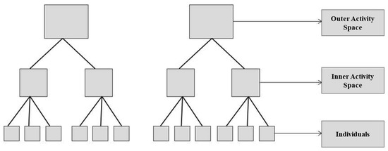 The Hierarchical Linear Model (HLM) is a statistical analysis technique used to analyze data with nested structures that can effectively affect organizational or background effects [38] and is mainly applied in the fields of medicine, public health, society, etc. [39,40]. On the one hand, different types of walking activities involve location differences and multiple co-linear characteristics of the built environment factors. On the other hand, the factors that affect the daily leisure walking activities of the elderly include the built environment, subjective cognition, and residents’ own socioeconomic background, and many other aspects have obvious multi-level nesting structure characteristics; therefore, they are more suitable for HLM models (Figure 5).