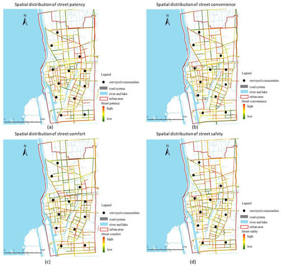 The block-scale built environment of Gaoyou City presents different spatial distribution characteristics from four aspects: unobstructed, convenient, comfort, and safety (Figure 6). According to the subjective and objective scores in the questionnaire survey, we conducted a comprehensive evaluation of the built environment quality around the main roads of the city. (1) In terms of road network patency, the old urban area scored high, while the outer suburban area scored low. The interior of the old town along the canal formed the gravity center of the slow traffic system. Within the range of short distance walking, the high values of network selection degree and integration degree of blocks were concentrated in the inner city. The road network density in suburban areas was relatively low, the block scale was relatively large, the urban branch road system was incomplete, and the road patency was relatively low. (2) In terms of service convenience of the block, an overall structure of continuous agglomeration along the internal main road and point-like dispersion outside was presented. This morphological feature shows that the convenience of block service was significantly affected by the single center architecture of the city. The comprehensive score of the old city area was high, and the overall structural expansion was insufficient, showing the spatial characteristics of regional agglomeration.