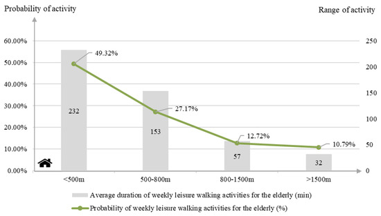 The results of questionnaire analysis showed that the occurrence rate of daily walking decreased significantly with the increase in distance within 1500 m. The results show that the longer the distance between the walking destination and the residence, the lower probability of the elderly walking to the destination. Among them, 800 m away from home (49.32%) is the core space of leisure walking activities for the elderly, which is called the inner activity circle. The space 1500 m (39.89%) from the home was the second most important choice, named the outer mobile sphere (Figure 7). In addition, the walking time of the elderly at different distances in the survey results also indirectly verified the above responses. The elderly spend an average of 232 min a week walking within 800 m of their homes. However, the walking time outside the 1500 m range was only 32 min, which was 1/8 of the time within the 800 m range (Figure 7). The results show that 800 m away from home is the core distance of daily leisure walking activities for the elderly, and 1500 m away is the second most important distance.
