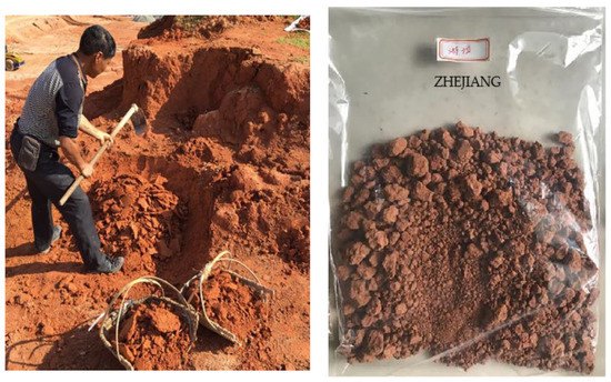 The red clay used for the test was taken from Qingyuan County, Zhejiang Province. The on-site red clay was brick red and clumped significantly; the air-dried red clay was primarily loose and reddish brown, as shown in Figure 1. Indoor tests on the physical parameters of red clay were carried out according to the test methods detailed in the Geotechnical Test Method Standard [23]; the results of which are shown in Table 1.
