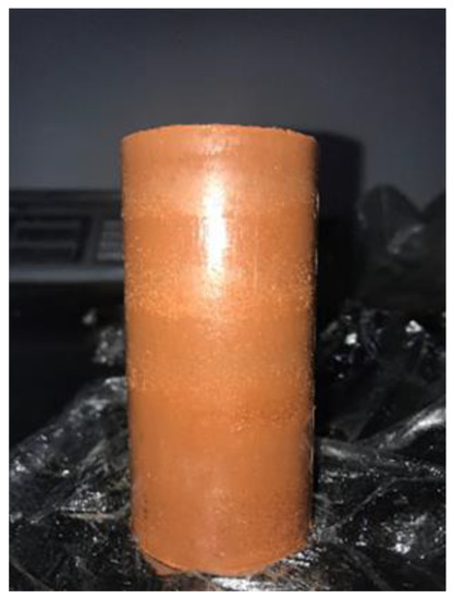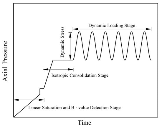 The test specimens were cylindrical, 50 mm in diameter, and 100 mm in height; further, they were formed by layered compaction, as can be seen in Figure 3. The specimens were first saturated until the pore pressure parameter B ≥ 0.96, and then consolidation was started. The test was carried out with isotropic consolidation. A biased sinusoidal wave [24] was used for the purposes of cyclic loading in order to simulate the effect of cyclic loading on the subgrade. The corresponding loading waveform is shown in Figure 4. Moreover, the test was stopped when the total number of loading cycles was at 10,000.