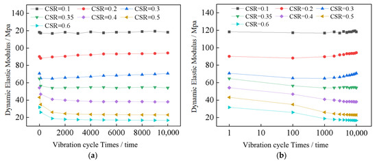 From Figure 5 it can be seen that: (i) The larger the CSR is, the smaller the dynamic elastic modulus is. The higher the cyclic stress ratio, the more significant the compression-density effect; additionally, the higher the cumulative plastic strain, then the lower the dynamic elastic modulus. (ii) The larger the CSR is, the faster the attenuation of the dynamic elastic modulus with cyclic vibration times is. (iii) When the CSR is less than 0.4, the dynamic elastic modulus decays to a minimum value at N = 1000 vibrations, from there increasing gradually and slowly. This is because the strain is minimal under low dynamic stress conditions. The specimen undergoes a phenomenon similar to compression hardening and crowding, with the dynamic properties gradually increasing. The above law of decay and the growth of the dynamic elastic modulus is consistent with the experimental results of Liu [25] and Huang [26]. (iv) When the CSR ≥ 0.4, the dynamic elastic modulus decreases rapidly at the beginning of loading and then decreases slowly.