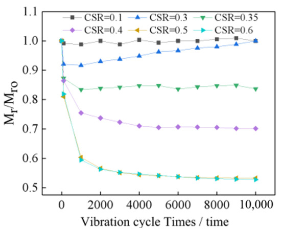 The Variation of the Relative Dynamic Elastic Modulus with Cyclic Vibration Times under Different CSRs.