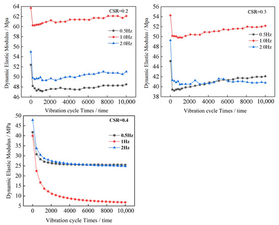 Based on the three sets of vibration frequencies (0.5 Hz, 1.0 Hz, and 2.0 Hz) selected in the experimental design, together with the results of the three groups of the CSR (0.2, 0.3, and 0.4), the development of the dynamic elastic modulus of the red clay with cyclic vibrations at different frequencies was analyzed, as is shown in Figure 8.