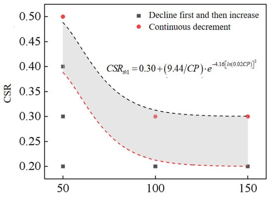 In Figure 10, the red dots are based on the confining pressure and CSR for the continuous attenuation style. Moreover, the black square dots are based on the confining pressure and CSR for the attenuation first and then the increase in type. Further, the grey area in the diagram is a possible area of the attenuation threshold cyclic stress ratio.