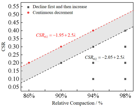 In Figure 11, the red dots are determined by the compactness and cyclic stress ratio of the continuous attenuation type. The black square dots are determined by the compactness and cyclic stress ratio of the first attenuation and then the increase in style. The grey area in the diagram is the possible area of the attenuation threshold cyclic stress ratio.