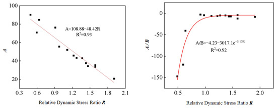 Figure 12 shows that parameter A, parameter B/A, and relative cyclic stress ratio R are in line with the linear (see Equation (8)) and negative exponential (see Equation (9)) functions. Additionally, the correlation coefficients are shown to be greater than 0.95.