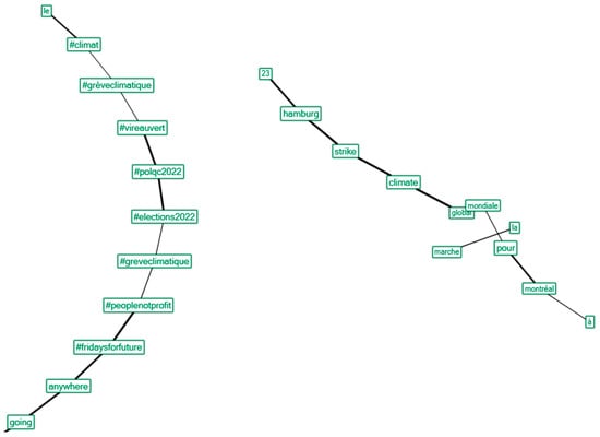 The graph generated by the pairs of words that appeared most frequently in the tweets of the entire network in general presents, as the most relevant topic, the demonstrations held on Friday, 23 September 2022, in all cities around the world. It is observed how the use of alternative hashtags accompanying #FridaysForFuture has been very common. Among others, the most used were: #peoplenotprofit (5505); #elections2022 (1659); #greveclimatique (1656); #vireauvert (1654) and #polqc2022 (1654). It is also reflected how the use of different languages (English, French, German) makes this international movement reach as many countries as possible and thus, tries to mobilize more young people (Figure 2).