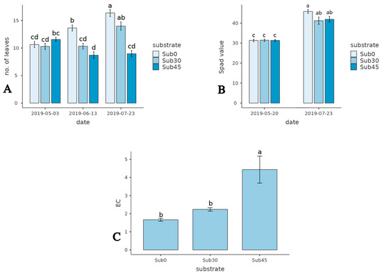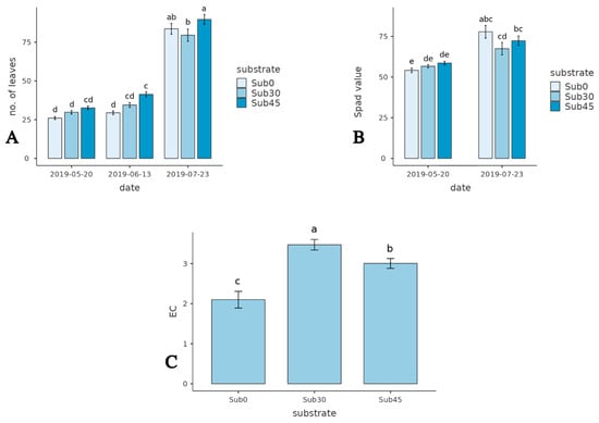Hazelnut tree pots—(A): trend in the number of leaves. (B): trend in the leaves’ chlorophyll content. (C): substrate electrical conductivity (mS cm−1). Within each graph, values with different lowercase letters indicate significant differences at post-ANOVA Tukey test (p < 0.05).