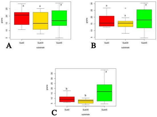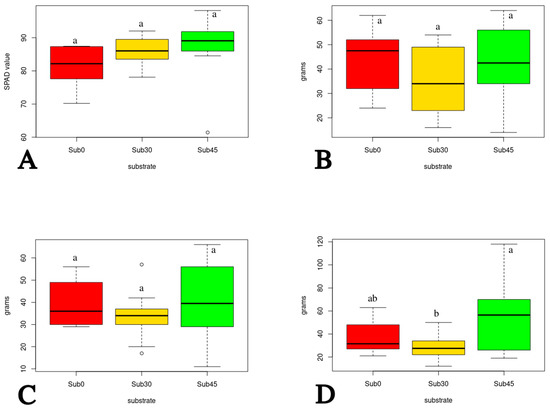 Analyzing in detail the graphs in Figure 2 and Figure 3, some greater variability in the results can be seen in the case of the Sub45 substrate; this could be an indication of a certain inhomogeneity of the substrate induced by the compost, although this inhomogeneity does not invalidate the good results obtained with the addition of compost. This is a very important factor to consider in nurseries, which need very standardized growing substrates to obtain seedlings with very homogeneous characteristics. Strong control of the materials used for composting and of the physico-chemical parameters of composting, therefore, becomes a determining factor in obtaining a compost with standard characteristics that can be easily used as a substitute for peat.