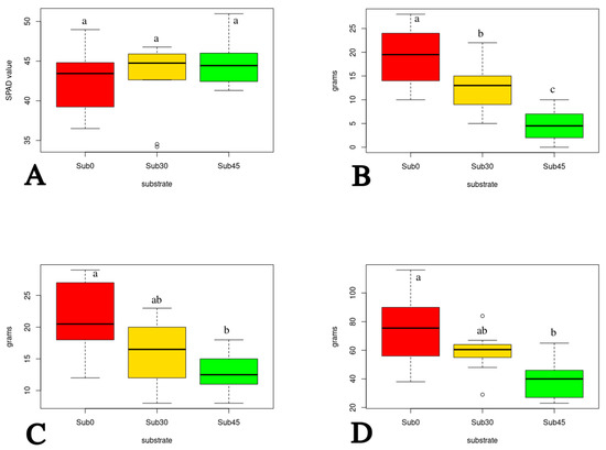 Hazelnut tree pots at the end of the growing season—(A): chlorophyll content. (B): weight of fresh leaves. (C): weight of fresh stem and branches. (D): weight of fresh roots. Within each graph, values with different lowercase letters indicate significant differences at post-ANOVA Tukey test (p < 0.05).