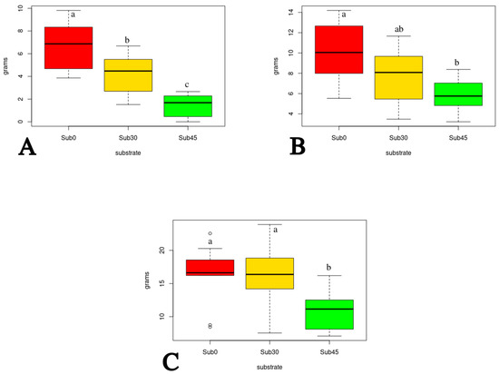 Hazelnut tree pots at the end of the growing season—(A): weight of dried leaves. (B): weight of dried stem and branches. (C): weight of dried roots. Within each graph, values with different lowercase letters indicate significant differences at post-ANOVA Tukey test (p < 0.05).