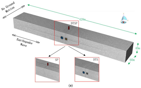 The existence of underground structures destroys the integrity of the soil, and the multiple reflections and refractions of seismic waves by underground structures affect the dynamic response characteristics of the soil in the site and thus the seismic response of the neighboring above-ground structures. In addition, the fluctuation field and additional stress field due to the inertia of the above-ground structures cause disturbances to the site soil and thus affect the seismic response of underground structures. For example, many underground projects and adjacent above-ground structures were damaged during the Hanshin earthquake in Japan [1], the Jiji earthquake in Taiwan [2] and the Wenchuan earthquake, the above-ground structure–soil–underground structure interaction has attracted research attention. Chen et al. [3] and Wang et al. [4] believed that the existence of underground structures cannot be ignored for the influence of surface structures. Lou et al. [5] emphasized the importance of surface structure–soil–underground structure interaction. The surface structure–soil–subsurface structure interaction should be considered in the structural design. Therefore, to ensure the overall seismic disaster prevention capability of cities, it is necessary to consider the seismic performance of both underground and adjacent above-ground structures, to study the seismic response law of the above-ground structure–soil–underground structure system as a whole, and to establish a simple, practical, reasonable, and feasible seismic analysis method.