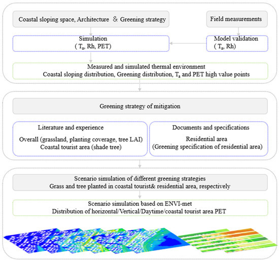 This study focused on strategies to improve the urban thermal environment with a coastal slope topography during summer. A typical site in Qingdao was selected for the study. The site is located on a sloping terrain facing the sea, with the sea breeze blowing towards the inner city in summer. The site includes two parts: the coastal green space (the tourist area) and the residential area, both of which are on the slope. There are many similar plots along the city’s long coastline. These sites are crowded with tourists and locals during the hot summer months. The greening strategy to improve the thermal environment proposed through this study will be of great significance for urban construction and people’s life. The influence of sea and land winds, the slope in the topography of the urban environment, and the influence of different planting forms on improving the urban thermal environment were studied. For the purpose of the study, the planting strategy was simulated by ENVI-met, and the PET thermal index was used to assess the thermal conditions in the study area. The study obtained a spatial and temporal resolution map of PET in the study area based on the design scenario. Hour-by-hour variations in the air temperature and PET were analyzed. The study compared and quantified the effectiveness of different planting schemes in urban spaces with coastal slope topography, and evaluated the improvements in the thermal environment. Based on the objectives and methods, the study route of this research is shown in Figure 1.