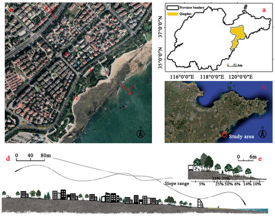 Schematic diagram of the study area. (a) Geographical location of Qingdao. (b) Location of the study area. (c) Study site: Sea Breeze Square (1–4 is the actual measurement locations). (d) A-A profile. (e) Profile of coastal green space.