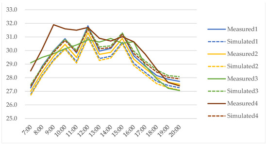 In the validation results, the temperature in general was slightly lower in the simulated values than the observed values. It can be seen that the simulated values of the coastal square (Point 1) and the grass (Point 2) were close to the observed values, and the change trend was consistent. The simulated values of the green parking lot (Point 3) and the residential undergrowth (Point 4) differed significantly from the observed values, but the trend was generally consistent (Figure 3).