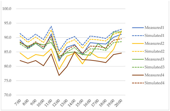 In terms of humidity, the simulated value was generally slightly higher than the observed value. The simulated values of observation Points 1, 2, and 4 were closer to the observed values, and the trend was consistent. The difference between the simulated and observed values of the green parking lot (Point 3) was more obvious (Figure 4).