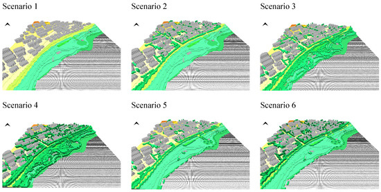 In order to study the mitigating effect of planting on UHI, six scenarios were designed for the coastal green space and the residential area according to different vegetation types and planting patterns. Scenario 1 is the green area with all lawn, and no trees in the residential area. Scenario 2 is a green area with all lawn, and black pine planted in the residential area. In Scenario 3, all areas were planted with black pine. In Scenario 4, all areas were planted with ash. In Scenario 5, the green area was planted with a grass, and the residential area was planted with black pine and additional seaside planting. In Scenario 6, the green area was planted with lawn, and the residential area was planted with ash and additional seaside planting (Figure 5).