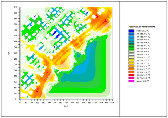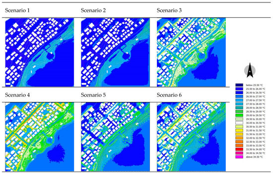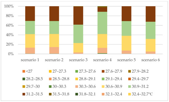 The simulation results for air temperature at 1.5 m height were divided in increments of 0.3 °C, and the temperature range distribution of each scenario was found. The air temperature of Scenarios 1, 2, 5, and 6 were below 31.5 °C across the region. The proportion of air temperature Scenarios 3 and 4 exceeding 31.5 °C was 0.4% and 2.3%, respectively. In the range below 31.5 °C, the proportion of air temperature in the relatively high range of 30.9–31.5 °C of Scenario 1 to 6 as 86.8%, 85.5%, 94.3%, 84.9%, 92.9, and 94.9%, respectively. In Scenarios 3 and 4, the proportion of high temperature range was significantly higher than that in other scenarios. In particular, the proportion in Scenario 4 was significantly higher than that of other scenarios, both in the relative high temperature range and over 31.5 °C (Figure 8).