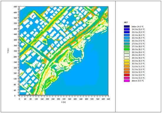 The simulation results of six different planting scenarios (Tables S2 and S3) showed that planting has a great influence on the PET at the height of 1.5 m. The highest and lowest PET in Scenario 1 were the lowest among the six scenarios, followed by Scenario 2. Scenario 4 had the highest average PET and the highest PET of the six scenarios (Table 5), 27.8 °C and 34.3 °C, respectively.