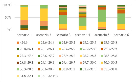 In terms of the percentage of each PET interval, Scenarios 1 and 2 were had a significantly higher percentage below 27 °C than Scenarios 3–6, reaching 98.5% and 98.7%, respectively. In the other four scenarios, temperatures lower than 27 °C accounted for 50–82.2%. For temperatures in the range of 27–28.5 °C, the proportions for Scenarios 3–6 were 32.5%, 32.2%, 14.6%, and 26.5%, respectively. The proportions of temperatures in the higher PET interval above 31.2 °C in Scenarios 3–6 were 3%, 7.7%, 0.7%, and 3.7%, respectively. The proportions of temperatures in the PET range below 27.3 °C in Scenarios 1, 2, and 5 were 98.7%, 98.9%, and 91.2%, respectively, and those of Scenarios 3, 4, and 6 were 72%, 56.8% and 81.3%, respectively. Overall, Scenario 1 and 2 achieved the best PET effect, followed by Scenario 5 (Figure 9).